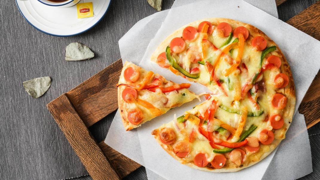 第八步:取出披薩,切成小塊就可以食用了,剛做好會很燙,要注意防護(hù)呀~