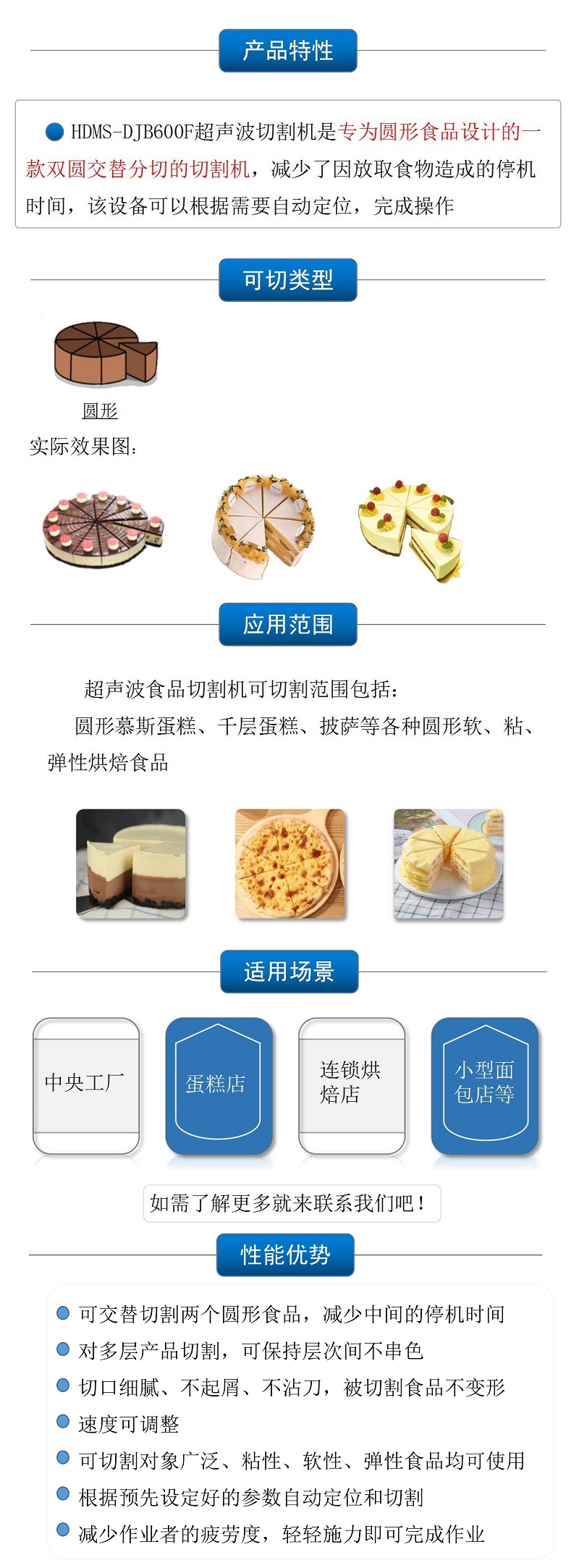 該設(shè)備配備單把超聲波刀片,可切圓形(只限一個圓蛋糕),也可切方形